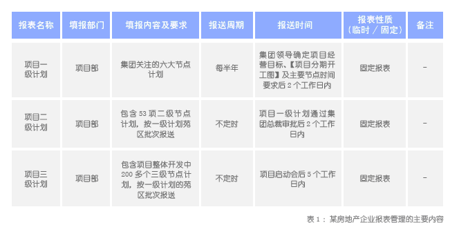 做好了运营报表,还需要建立配套的管理制度和指引,规范报表使用,重点需要明确的内容包括填报对象、填报要求、报送周期、报送时间等内容,表1 为某房地产企业报表管理的主要内容。