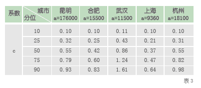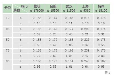 通过对昆明、合肥、武汉、上海、杭州等地区的数据的代入验证,项目组得出了abc 随不同城市、不同分位变化情况的统计,如表1 所示: