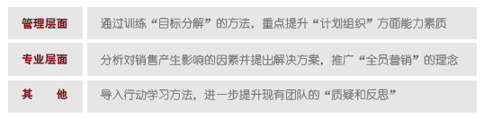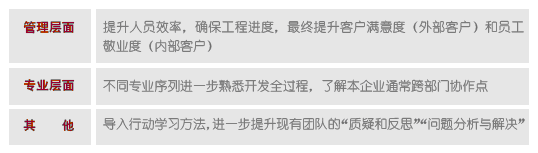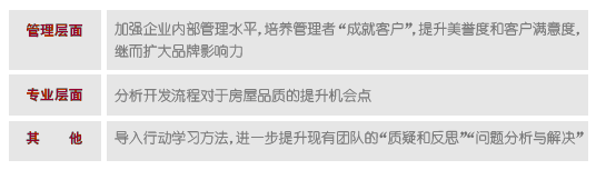 本次行动学习有三个主要目标:一是促进各个部门之间跨部门协作——通过不同专业部门的“群策群力”来找到问题的深层次原因,各个专业部门经理坐在一起,从开发、营销、设计、工程、客服、成本、财务不同视角分析企业现阶段出现的亟待改善的问题,从别人的经验里思考和学习。二是促进组织能力的提升——各大专业协调配合,系统性地解决问题,发挥各大专业的“协同效应”。三是力争实现人才的加速培养——“在战斗中学会战斗”,各级管理者在“干中学”,通过质疑和反思,实现自我完善。