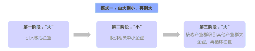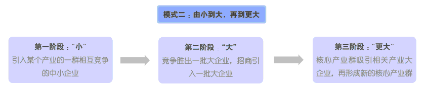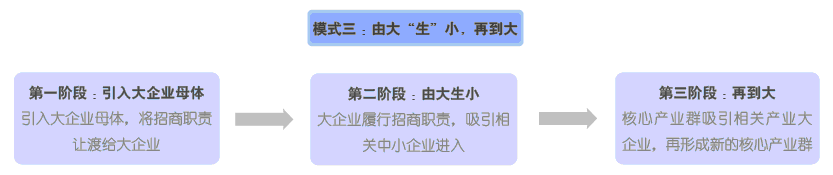 第三种, 由大生小, 再到大。考虑大企业整体“搬迁”成本,此种模式需要有合适机遇引入大企业“母体”,遇有区域整体产业升级或产能外迁等机会,可考虑此种模式。