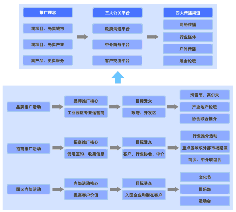 通过政府、中介商务和客户交流三大平台,综合运营网络、媒体、户外、展会等,举办品牌推广、招商推广和园区内部活动的形式,宣传项目。