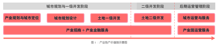 产业地产的核心在于以产业为依托,以地产为载体,实现土地的整体开发和运营。这种经营模式结合我国新型城镇化建设的总体思路,很好地将“地产、产业、城市” 三者进行了有机结合,进而形成三者相互促进的商业模式,并且成为产业新城建设的核心逻辑。也就是说,通过土地的整体开发和运营,导入产业,集聚产业人群,开拓城市边界,优化产业布局,促进产业升级,完善城市功能,最终实现具有“可持续、可循环、内生发展动能”的产业新城建设。其价值链由此横跨一二三级市场,包括产业规划、城市规划、土地一级开发、二级开发和后期城市运营服务。
