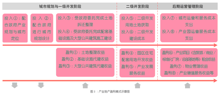 产业地产项目价值链跨度大、盈利模式丰富,叠加效益巨大。调查报告显示,“产业地产开发可以获得数倍于房产项目的高利润”。根据实践案例及价值链分析,至少有如下八种盈利模式。“土地整理收益可占整体收益的30%、园区住宅配套的开发收益占比高达50%” ,也就是说在项目建设的中段回报丰厚,如图2 所示: