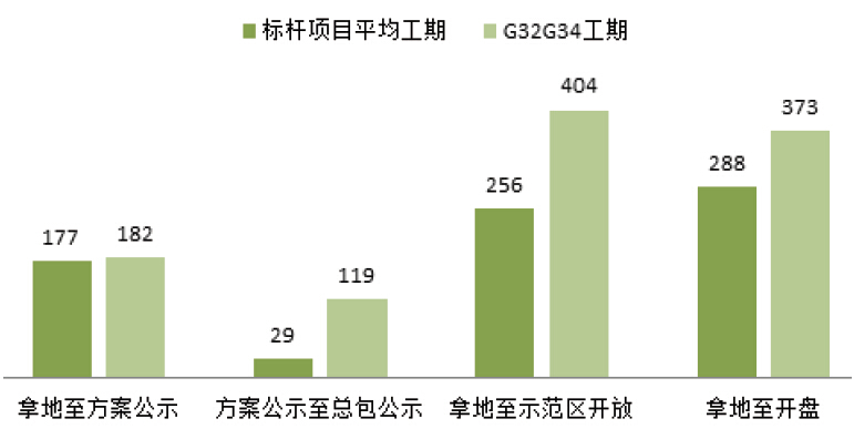 G32G34 项目与标杆项目的平均工期相比,每个阶段均有所滞后,其中,拿地至示范区开放的时间差距尤为突出,接近5 个月,公司在示范区营建方面的能力亟待提高。