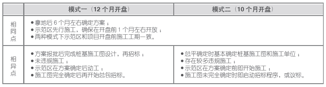 其中的关键因素在于:能不能保证方案设计阶段出的施工图后期不会出现较大调整?有没有长期合作的优秀总包单位愿意在方案未定的情况下开展合作并共同承担后期可能出现的成本变动?能不能通过政府关系维护,保证违规施工时不会因政府阻挠导致长时间停工或超出可承受范围的处罚?示范区方案在总平方案之前确定,有没有把握不会在方案调整后出现大面积返工?