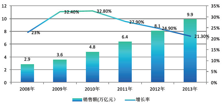 2013 年我国电子商务市场交易规模达9.9 万亿元,同比增长21.3%,预计2014 年后未来几年增速放缓,2017 年电子商务市场规模将达21.6 万亿元, 将保持持续增长态势。(图1)