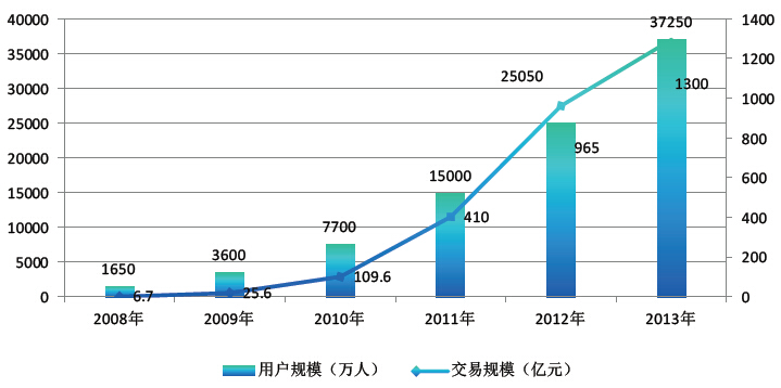 移动电子商务异军突起,2013 年我国移动电子商务市场交易规模超过1300 亿元,同比增长34.72%。(图4)