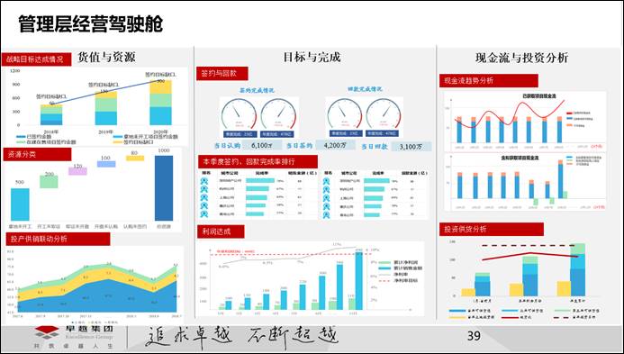 由于有较高的数据治理水平,卓越置业集团目前正通过元年科技公司将赛普工作小组完成的这套经营指标体系及经营看板体系开发为线上版的经营看板系统,打造全组织、全专业、全层级能够实时查看和分析经营活动的信息化平台。这个信息化平台的打造,未来将达到“数据驱动运营,动态可视化管控”的大运营精细化管理状态,引领房地产行业运营管理提效的发展水平。