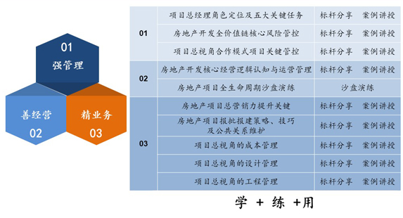 项目总经理高级研修班,是赛普在深度分析行业项目总能力要求的基础上进行系统规划,围绕项目总善经营、强管理、精业务三个纬度、九项能力设计的高端人才培养项目。研修班采用学、练、用的创新教学模式分阶段开展,后续两阶段将通过标杆实操及互动研讨形式进行分享,包括以下三个课程:《项目总视角合作项目关键管控》、《房地产项目报批报建技巧》、《项目总视角的成本管理》。