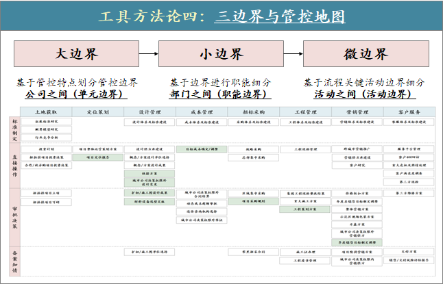 基于全价值链逐步细化管控权责边界,包括业务单元间大边界、部门职能间小边界与业务活动间微边界,最终清晰表达各专业条线管控内容。