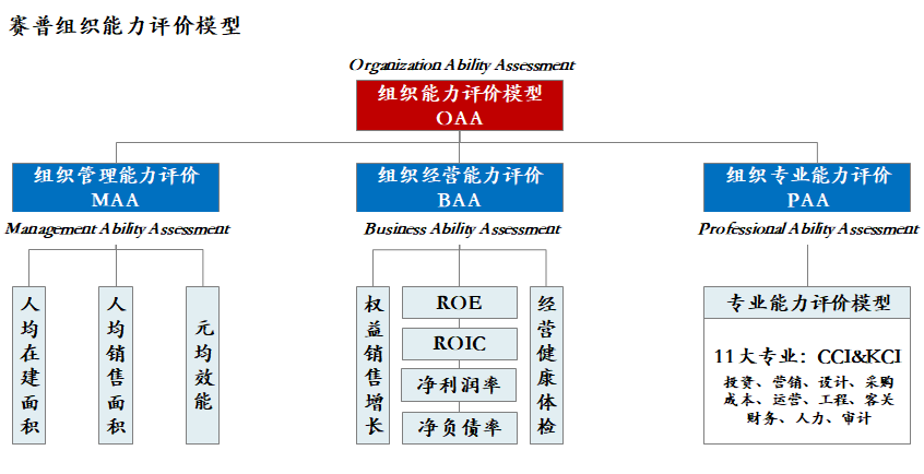 房地产组织和与运营能力评估模型赛普是以有品质增长为导向,以实现增长、效率(益)、风险铁三角的平衡性为基础设计;模型将包括组织能力(总评)+3个子能力(组织管理能力+组织运营能力+专业能力)。