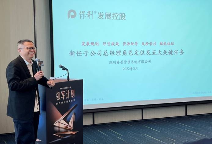 2月开始保利经过前期的深入调研了解,最终邀请赛普咨询为领军计划学员量身定制首开课程《新任子公司总经理角色定位及五大关键任务》,3月6日新任总经理专题班第一期开营 ,“领军计划”16位新提拔的子公司总经理参加首开课程,课程针对新任总经理面临最急迫的问题、应该做好哪些事、要避开那些坑这三大困惑,同时结合保利帅才“经营思维、勇于开拓、突破创新、塑造团队、政治定力”五大能力评价标准设计,通过工作场景化导入,分享管理逻辑及对策,并帮助提炼保利子公司总经理五大任务20项关注点,让新任总经理清晰认知其当前的角色定位,实现从专业条线到总经理的角色转变,深刻理解需要承担子公司“发展规划、经营提效、资源统筹、风险管控、赋能组织”五大核心任务。保利最高领导班子对本次培训高度重视,保利发展控股集团党委书记、董事长刘平和党委副书记、总经理周东利,党委副书记胡在新莅临现场并发表了重要讲话,胡在新总肯定了本次课程的重要性,希望各子公司总经理要找准自己的定位,带领团队攻山头、谋发展。