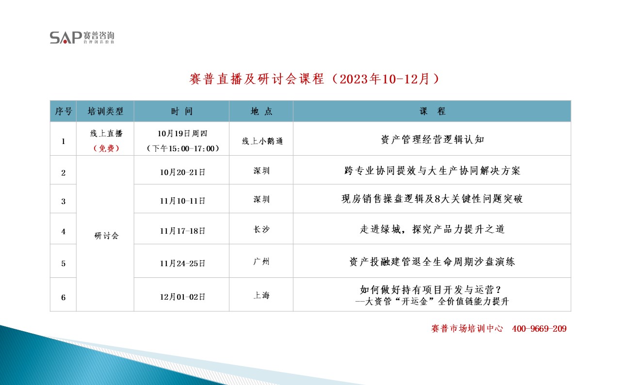 至此9月赛普举办的《合作操盘十大关键场景困局与应对》、《如何做好代建管理与风险应对?》三大高质量研讨会圆满结束,第四季度赛普将围绕“协同提效、产品力提升、现房销售、资产提升”等主题开展系列专题研讨会,助力房企转型升级稳健发展成功穿越周期。