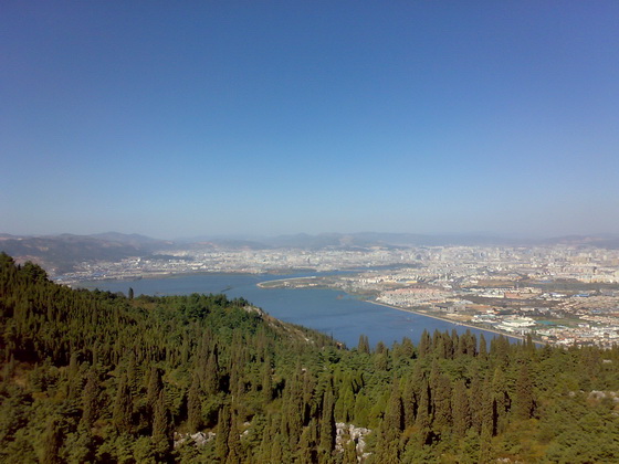 站在山顶临风而立,远眺西山东侧的滇池。只见那一湖清水,在湛蓝的天幕的映衬下,仿佛一位出世的隐士,依在西山脚下,看着身边那一幢接一幢高楼拔地而起,看着身边的闹市一夜复一夜地喧哗,看着身边的凡人一日复一日地忙碌。
