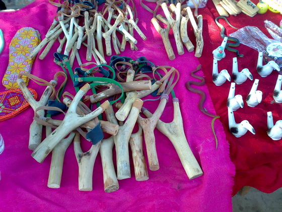 山下一些摊贩,在地上铺开一块或火红或玫红或明黄或土黄的布,上面摆开各式各样的山里人家的手工工艺品。仔细一瞄,居然看到那中间有一摞树丫做成的弹弓,让人不禁想起儿时成群结伴到处调皮捣蛋的日子,遐想联翩。