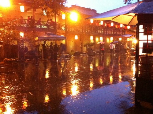 挂满许愿香囊的许愿树下遇上微凉的夜风,古色古香的门楼下躲避打到脸上略感冰冷却沁人心扉的雨。