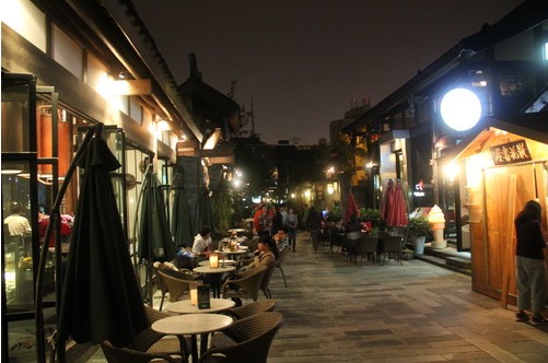 从座无虚席的露天的酒吧,到人影幢幢的咖啡厅,到寂静的小店,一路闲步走来,或是轻柔或是有力或是怀旧或是竭斯底里的音乐在成都的夜空中此起彼伏。巷子的尽头,整整齐齐地展出向我们这样的游人展示这里秋天美景的摄影和油画。若隐若现的各色面孔,带着各色的目光,在展品上停留,然后离去。