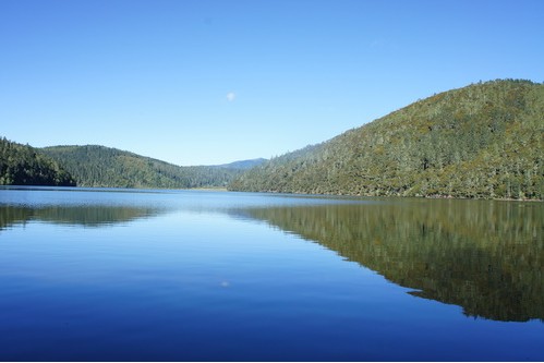 行进到布达措国家公园,一股冷气袭来,倍感高原凉爽。乘坐环保汽车环游原始森林,枯藤,老树,昏鸦,流水,却不见小桥,人家。远古的树木尽情展现着伟岸与强壮,腾枝的小草开始爬满天涯,湖水处一颗老逝的树骸,偶尔能停上几只小鸟,原来这才是桃源。看到草甸时,牦牛已经开始迁移,还有一些老马在草甸中点缀着蓝天,绿到深处时,原来天地相连,正是人间天堂。