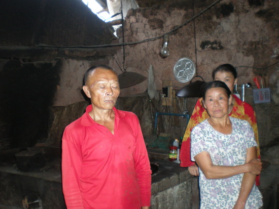 实录1:晓燕家土胚房的厨房里只有桌凳,厨房上面盖着茅草,透着光。